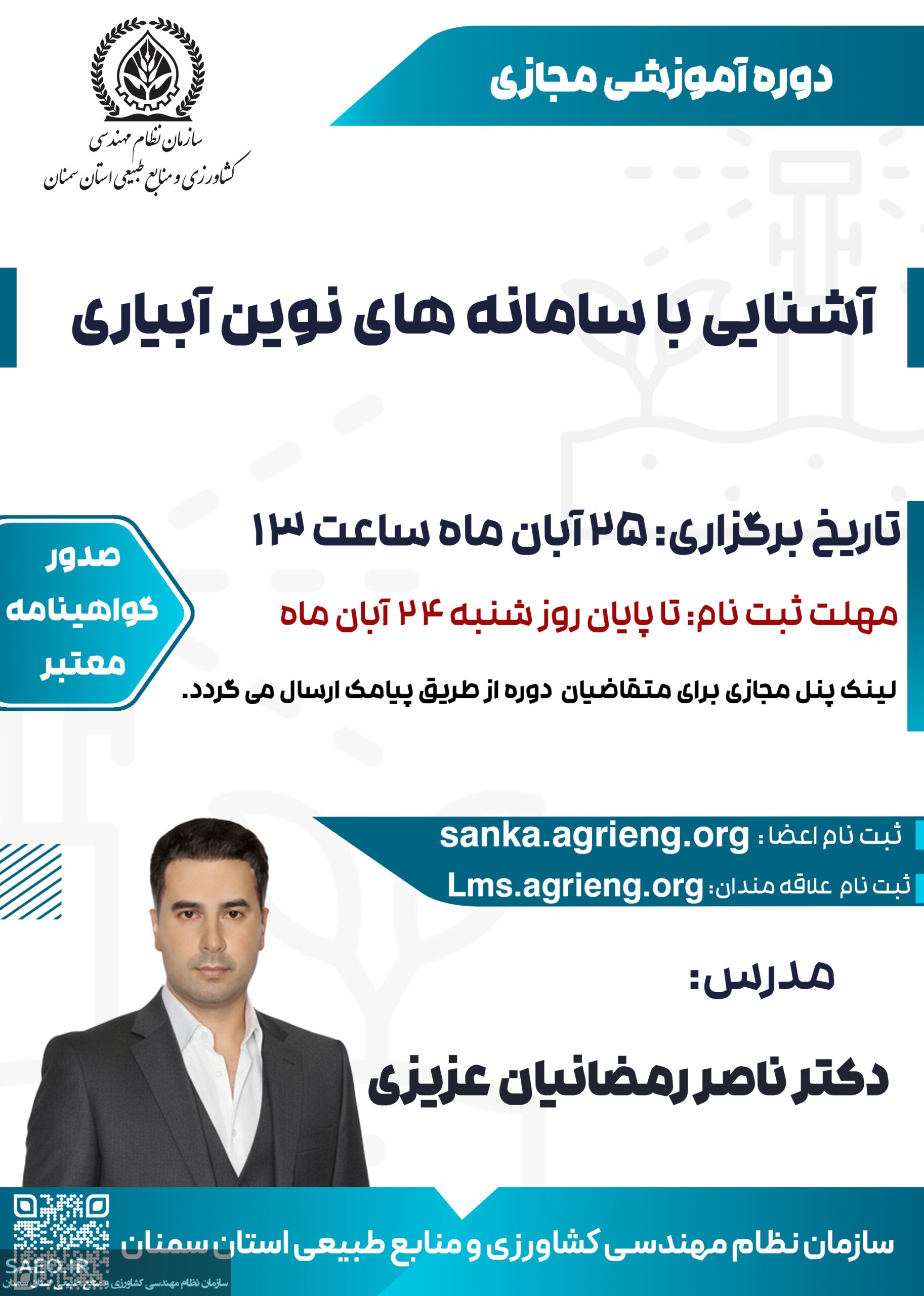 تاریخ برگزاری: 25 آبان ماه ۱۴۰۴ ساعت شروع: 13 مهلت ثبتنام: تا پایان روز شنبه 24 آبان ماه مدرس: دکتر ناصر رمضانیان عزیزی ثبت نام اعضاء: sanka.agrieng.org ثبت نام غیر اعضا و بهره برداران: Lms.agrieng.org لینک پنل مجازی برای متقاضیان دوره از طریق پیامک ارسال می گردد. روابط عمومی سازمان نظام مهندسی کشاورزی و منابع طبیعی استان سمنان